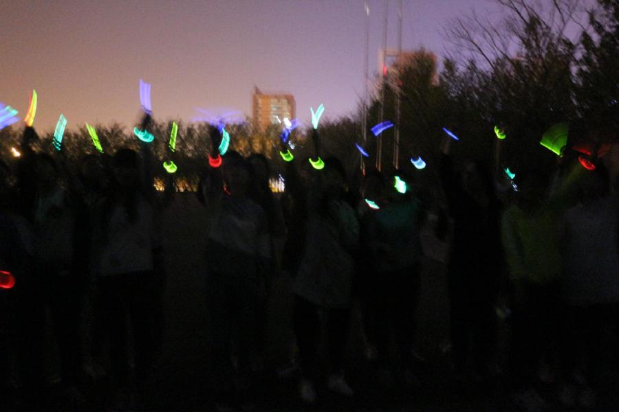 活动首先进行了“节能你我行,环保我签名”的签名,同学们踊跃在条幅上签名,表达践行环保节能的决心。随后,“微长跑”活动正式开始,同学们在校园里挥舞荧光棒,围绕校园进行长跑,期间进行了叠罗汉、扔瓶子、夜光找找看等趣味活动。