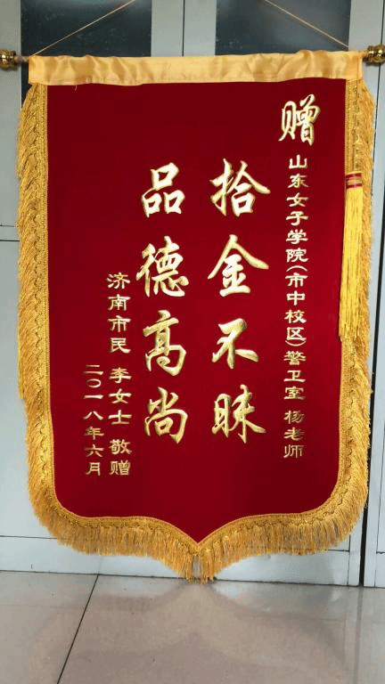 7月4日上午8:40,两名50岁左右的妇女来到山东女子学院物业办公室,送来了一面锦旗,激动地讲述了她的包失而复得的经过: