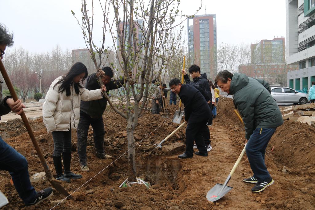 植树现场在园林师傅的指导下,师生们不顾雨后泥泞,三人一组,分工合作,调放树苗,挥锹铲土、扶正压实,一棵棵海棠树整齐栽植在教学实训楼前,形成了一道绿色风景线。(吴博)