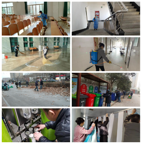二、保障校园环境干净、卫生、安全。物业管理中心组织人员对办公楼、教学楼、图书馆、学生公寓、道路、广场等楼内外进行清洁消杀通风,对直饮水机、售货机、洗衣机、电吹风、浴室等服务设备进行全面清洁消杀、维修维护等。