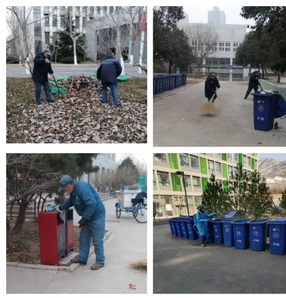 坚持每日清扫路面杂物,清除枯枝、落叶和卫生死角等。定期清理雨水落水口、窨井下树叶、垃圾等,保障雨水畅通,防止出现雨水漫灌路面等问题。每日对校园内的260余个室外果皮箱、垃圾桶以及垃圾中转站进行清理、保洁和消杀,保持校园环境整洁卫生。