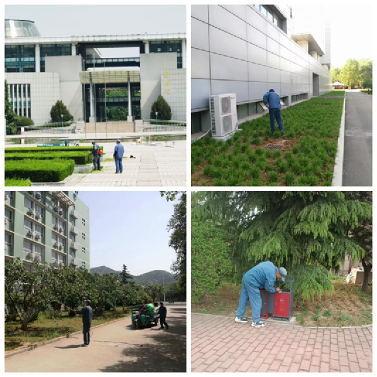 三、做好保洁消杀与绿植养护。物业管理中心利用假期开展业务培训,提高专业技能和服务质量。坚持各楼宇24小时值班值守,每日清理校园垃圾和消杀,坚持不懈净化校园环境。根据校园花草树木长势,及时修剪枯枝、移栽密树,清理杂草、浇水施肥、裸土补栽、防治病虫害等,绿化美化校园环境。