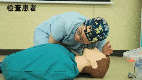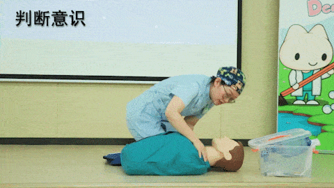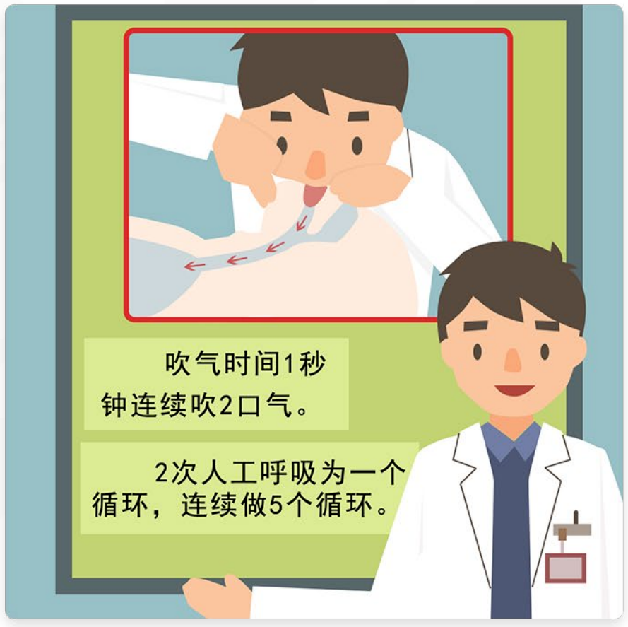 以心脏按压:人工呼吸 = 30:2 的比例进行,操作5个周期。(心脏按压开始送气结束)