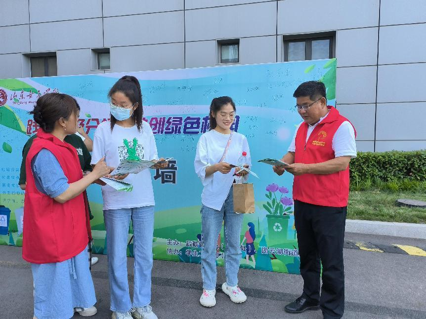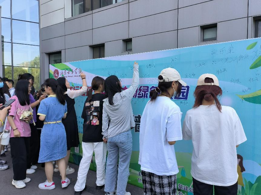 宣讲会后,广大师生在求真楼东广场宣传墙上签名,庄严承诺“践行垃圾分类,共创文明校园”。崮云湖街道办事处和后勤管理处(基建处)的垃圾分类宣传员向广大师生发放了《崮云湖生活垃圾分类居民指导手册》等宣教资料,并对校园分类垃圾箱和厨余垃圾等进行了现场检查指导,进一步教育指导广大教职工和同学们积极宣传和志愿践行垃圾分类工作,共建卫生环保绿色校园。