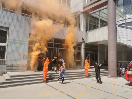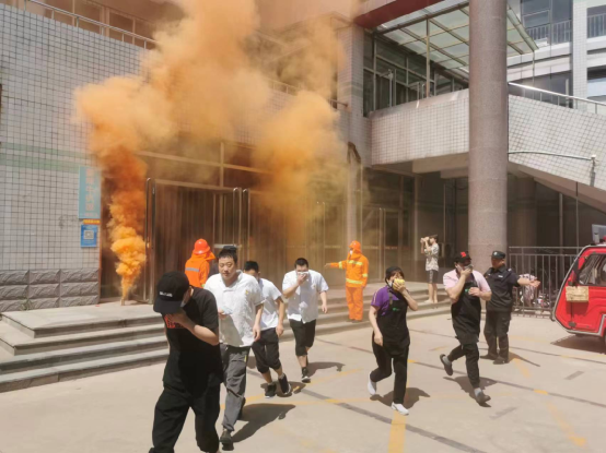 在保卫处消防科专业人员指挥指导下,工作人员点燃烟雾弹,鸣哨通知所有人员撤离火灾现场。在逃生过程中,工作人员按照正确的逃生方法,模拟正确报警、疏散逃生集合后清理汇报人员、救助组采取相应救助措施。演练结束后,保卫处负责人强调了消防演练的重要性,指出了存在的不足和整改措施。