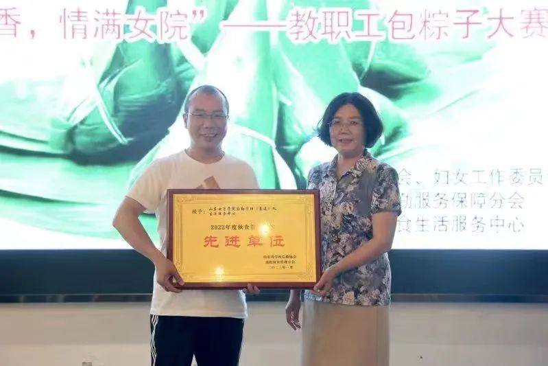 参赛选手在观看完教学视频后,体验并练习折粽叶、填糯米、裹叶子、捆扎线等工序。包粽子比赛进行得热火朝天,在参赛选手的努力下,一片片清香的粽叶、一粒粒晶莹的糯米在他们灵巧的手中变成一个个精致饱满的粽子。经过评委现场打分,旅游学院分会、后勤服务保障分会和外国语学院分会获得本次比赛前三名,评委们为获奖选手颁奖。活动最后,杨恩红为在2022年工作中表现突出,荣获“山东省高校伙食管理工作先进个人”、“疫情防控先进个人”的王仕忠、张传瑜、高庆伟等同志颁奖。