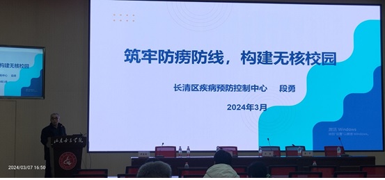 校医院苗天爱院长主持了培训会议并向师生介绍了主讲人,防痨专家段勇副主任医师。段主任对于结核病的校园防治有着丰富的经验,他从结核病的起源、传播方式、结核病的概念、学校结核病日常防控、学校结核疫情处置流程等多个方面进行了详细讲解。