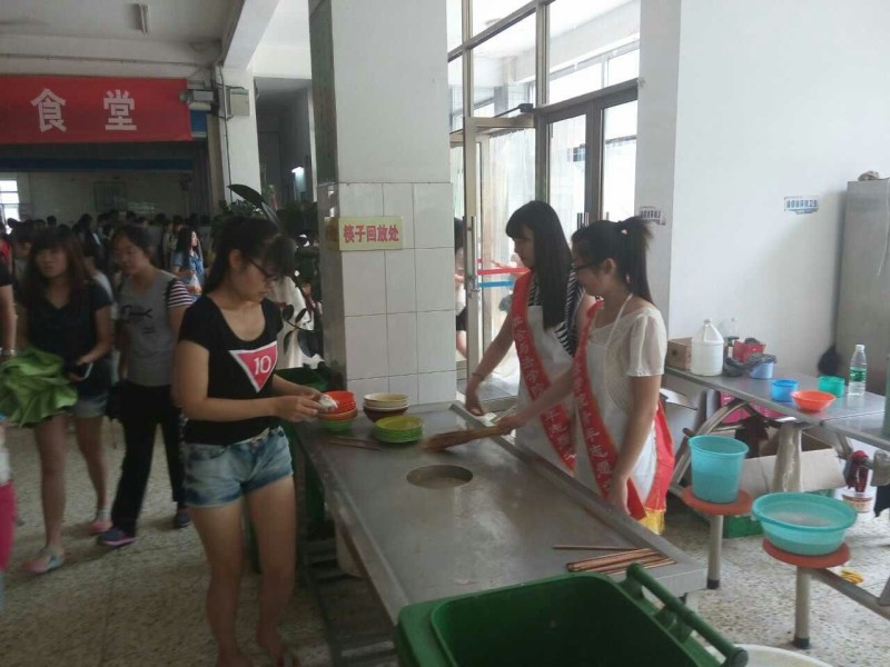 学生志愿者到食堂帮助收餐,进行“光盘行动”宣传