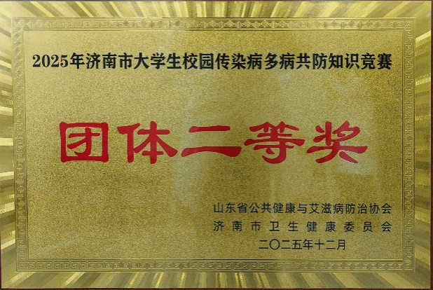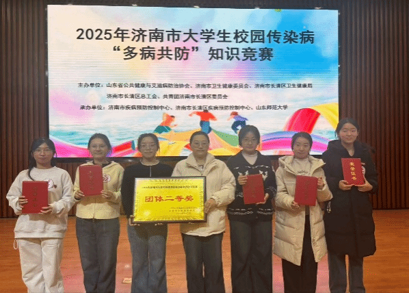 2025年12月3日,由山东省公共健康与艾滋病防治协会、济南市卫生健康委主办,济南市疾控中心、山东师范大学承办的济南市大学生校园传染病“多病共防”知识竞赛决赛在山东师范大学文昌楼落幕。我校学生代表队沉着应战,荣获团体二等奖。